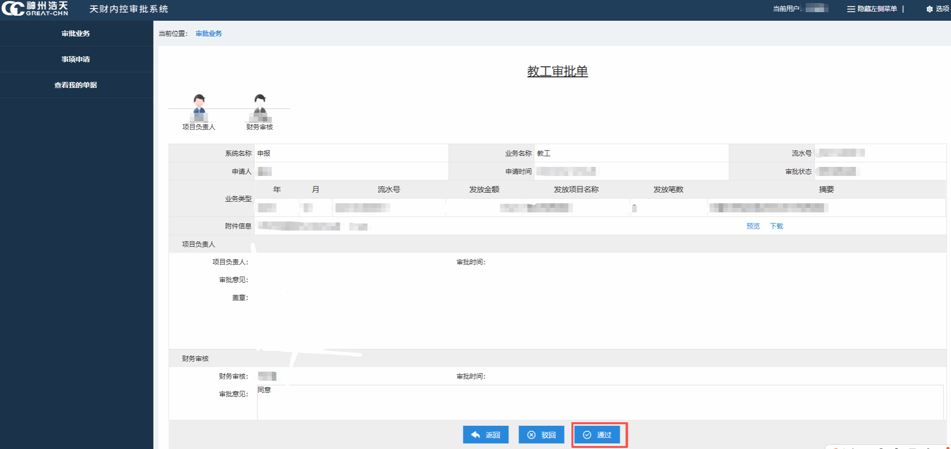 Tips:项目负责人审批通过后,后续由财务审核,审核通过后财务系统自动接单,无需投递。若财务审批不通过,会通过地大财经公众号推送消息。