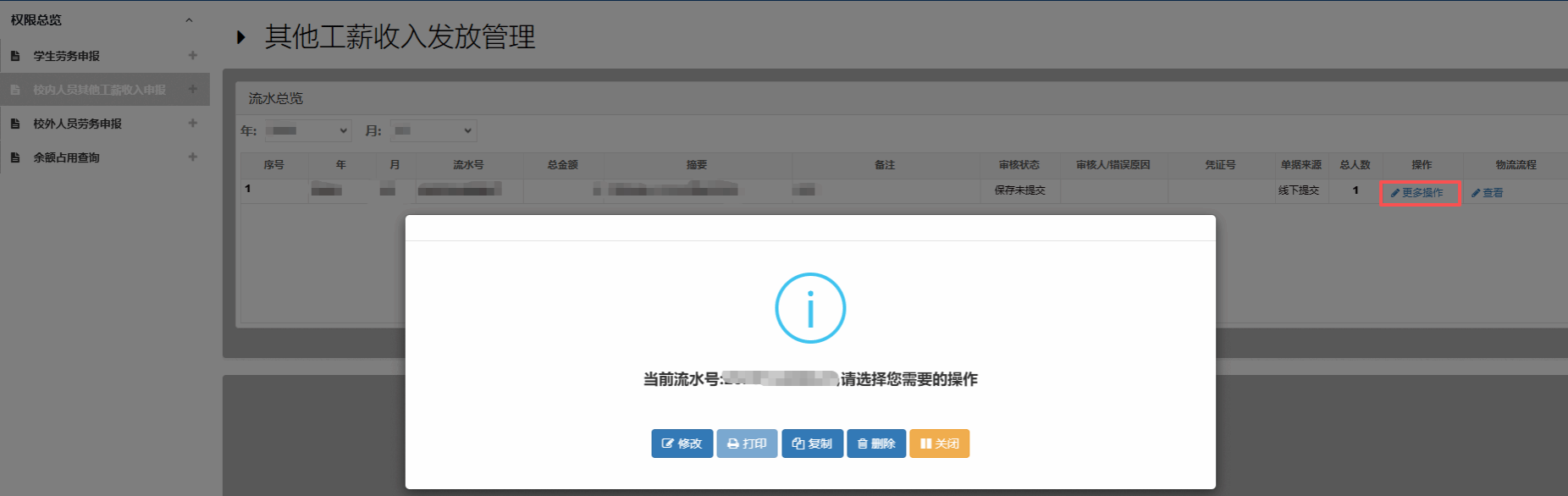 2.若单据被审批人驳回或财务审核未通过,经办人可在“其他工薪收入发放管理”中,点击“更多操作”进行修改或删除。