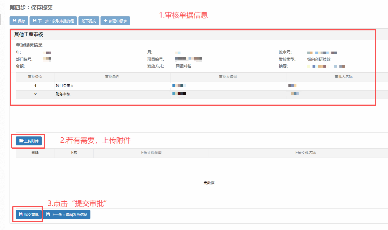 此时会出现“其他工薪审核”相关信息,核对单据信息及审批流程,如果有附件要上传,在“上传附件”处上传说明文件等。审核信息或上传附件完成后点击“提交审批”按钮即可,见下图: