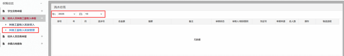 1.在“校内人员其他工薪收入”模块,点击“其他工薪收入发放管理”,选择单据对应月份进行查询。