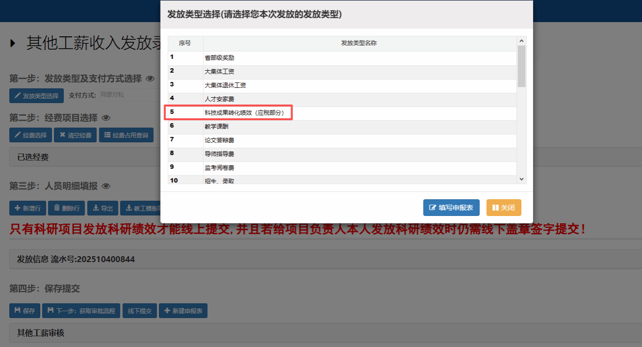 Tips:(1)若后续还需补充材料或修改单据,仅点击“保存”按钮。后续可在“工薪收入管理”或“校内人员其他工薪收入申报-其他工薪收入发放管理”中继续修改。(2)若为新申请项目,显示“审批流程无法读取,请联系管理员”,可联系收入管理科(027-67885058)咨询工程师进行流程设置。