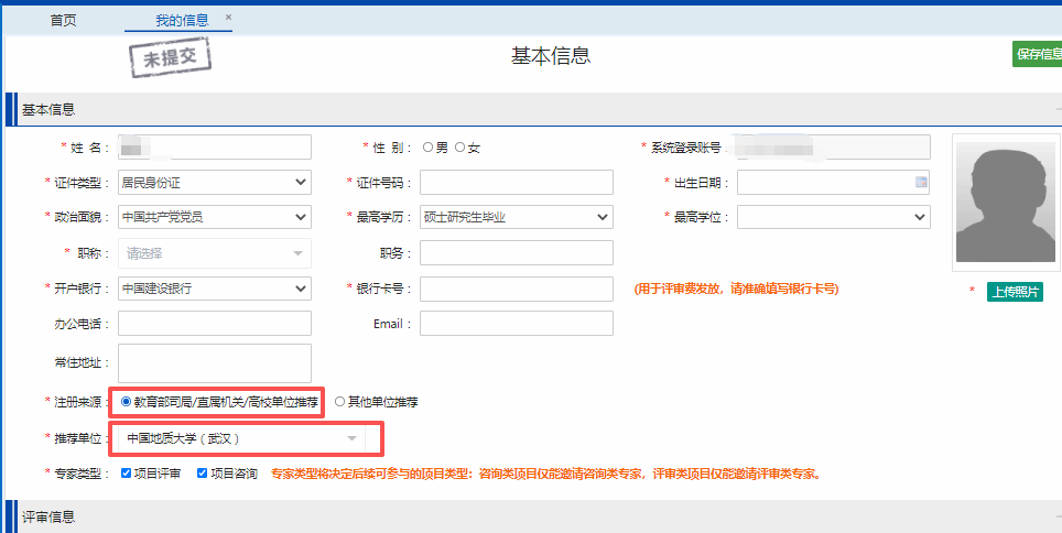 2.完善信息:注册成功后点击“现在登录”按钮,登录系统之后会自动跳转到信息完善页面,在基本信息中注意选择单位推荐,具体见下图: