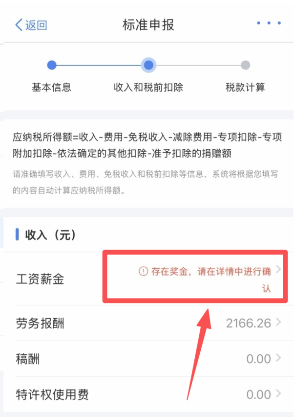 如果“工资薪金”栏右侧未提示奖金信息,则可以直接跳过此步骤,进行下一步。