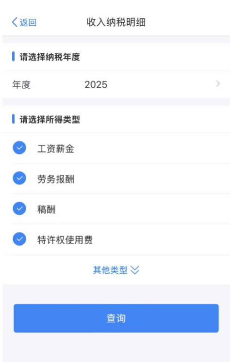 在“汇算准备”页面点击【收入信息】,在“年度”栏选择【2025】,系统默认全部勾选,点击【查询】,即可查看2025年度全年的收入纳税明细。确认完毕可以直接点击【返回】。