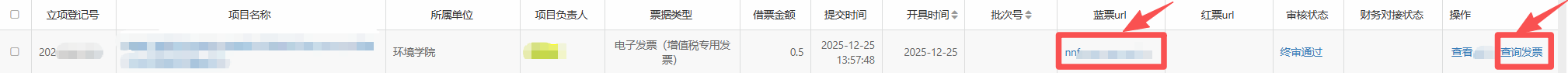 审核通过后,点击“操作”下的“开票”按钮,等待1-2分钟后,点击“操作”下的“查询发票”,提示“发票已开具,是否前往下载发票?”,点击“确定”,电子票据即开具并发送至邮箱。